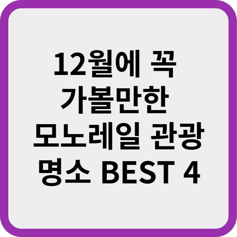 12월, 국내에서 가볼만한 모노레일 관광 명소 BEST 4를 소개했습니다. 위에 언급한 관광명소의 방문으로 따뜻한 감동이 가득한 겨울 여행을 즐겨보세요. 여러분의 특별한 순간을 만들어낼 국내 명소들을 모노레일과 함께 체험해 보시기 바랍니다.