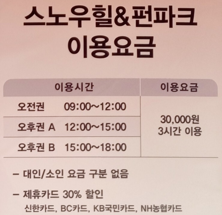 스노우힐 & 펀파크의 이용요금은 대인/소인 구분없이 1인당 3만원입니다. 자세한 이용시간과 할인카드에 대한 설명은 아래와 같습니다. 인터넷으로 이용시 좀더 저렴한 가격으로 구입이 가능하니 확인해보시면 좋을 듯 합니다.